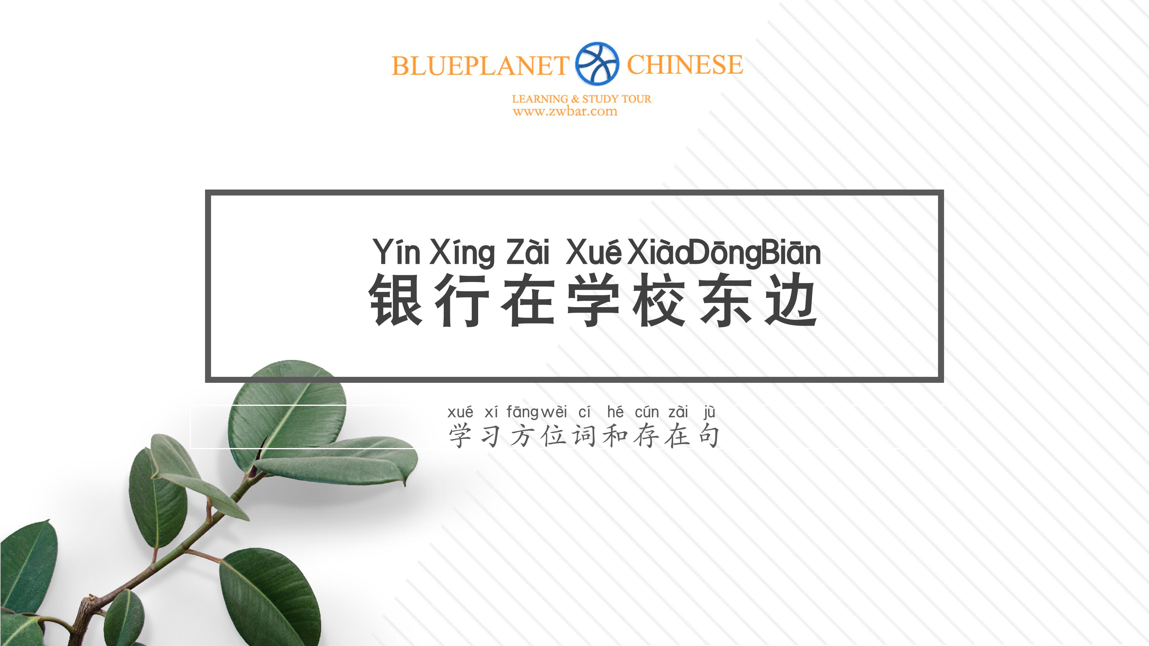 - learn how to ask and answer questions about location positions in Chinese, such as "where is the bank?", "what's to the east of the school?";